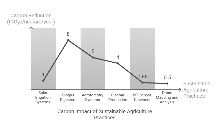- Biochar application: The farm applied approximately 8 tons of biochar per hectare, which has a carbon content of about 80% and remains stable in soil for hundreds of years.