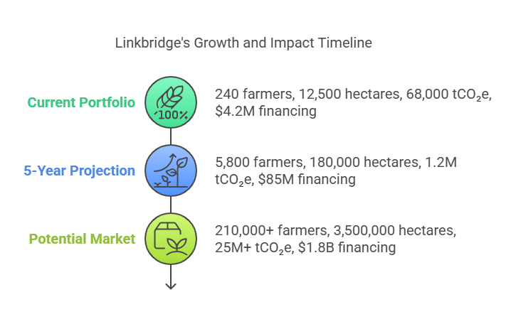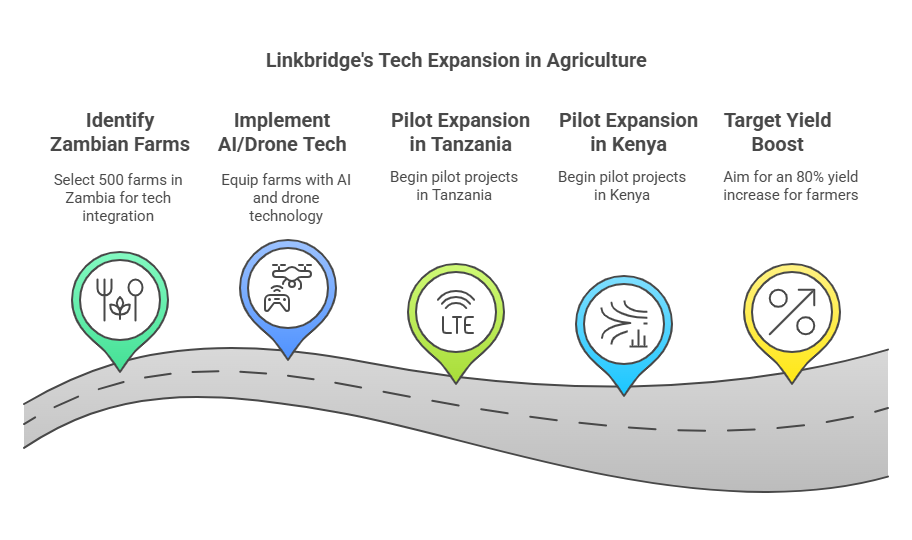 Linkbridge aims to equip 500 Zambian farms with AI/drone tech by 2025. Pilot expansions in Tanzania and Kenya target 80% yield boosts for 10,000 farmers.