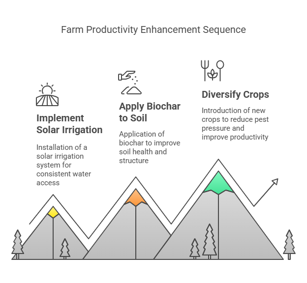 - Elimination of diesel pumps: Before intervention, the farm relied on diesel-powered irrigation pumps, consuming approximately 4,200 liters of diesel annually at $2.95/liter.