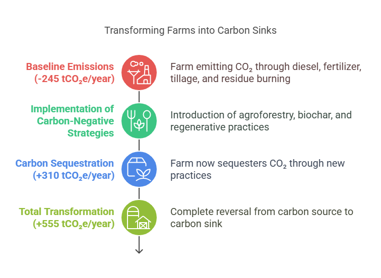 - Negative baseline: The negative number (-245) indicates the farm was emitting 245 tons of CO₂ equivalent annually through: